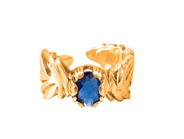 A ring with delicate organic shapes, adjustable and embellished with a blue chalcedony stone.