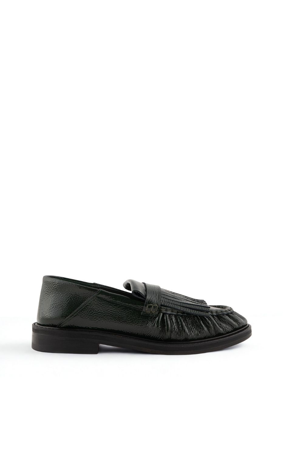 A soft pleated loafer model with a handmade oversized fringe, in crinkled bottle-green varnished leather. A sleek take on a classic infusing texture and tone with classic sophistication. A statement of modern elegance, authenticity and comfort with a supple and breathable sole.