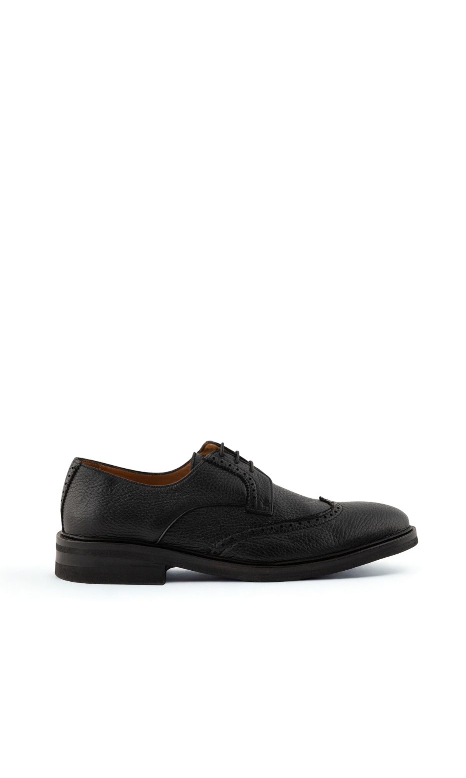 The most versatile derby for any wardrobe. Crafted from a premium soft black leather with a distinct natural grain, its elegant silhouette is defined by classic perforation. As final elegant touch, features 3 hole lace up closure.